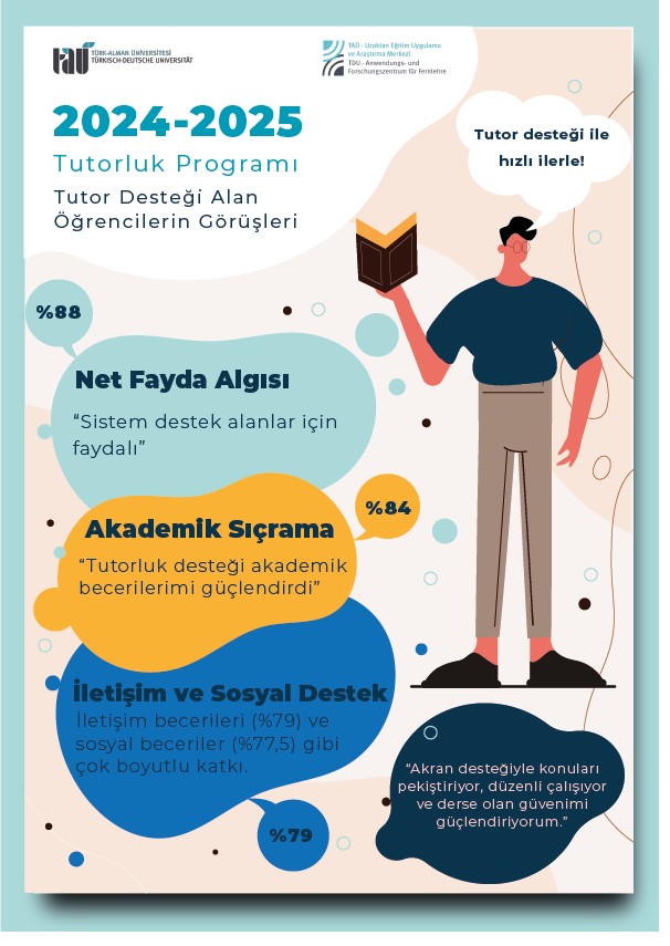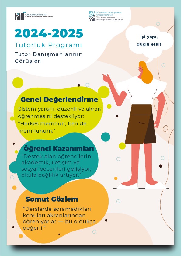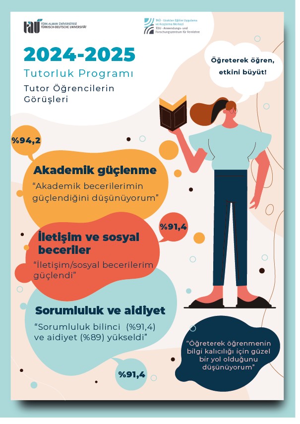 2024-2025 akademik yılında TAÜ Tutorluk Programı öğrenciler, Tutorlar ve Tutor Sorumlusu danışman hocaların aktif katılımı ile başarıyla uygulanmış; yüksek memnuniyet ve somut öğrenme kazanımlarıyla tamamlanmıştır. Program, bu yıl da anketlerden elde edilen sonuçlar doğrultusunda güçlendirilmiş yapısı ile devam etmektedir.